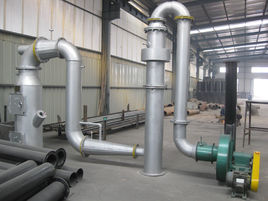 二燃室為一垂直于地面的圓柱型筒體,其主要作用是對(duì)回轉(zhuǎn)窯體未燃燼的有害物質(zhì)作進(jìn)一步的高溫分解,同時(shí)也可將部分液體廢物噴入焚燒。為了使未燃燼物質(zhì)徹底分解,二燃室設(shè)有二次進(jìn)風(fēng)裝置和發(fā)生爐煤氣噴嘴,以保證煙氣在高溫下同氧氣充分接觸和煙氣在二燃室的滯留時(shí)間。二燃室進(jìn)風(fēng)量的大小可根據(jù)其出口煙氣的含氧量自動(dòng)調(diào)整。二燃室為耐火磚結(jié)構(gòu),內(nèi)部為高鋁耐火層,以珍珠巖和硅酸鋁纖維氈作保溫層,外部為耐熱鋼板。為保證系統(tǒng)的安全性,在二燃室的頂部設(shè)有緊急排放安全閥。緊急排放安全閥可根據(jù)事先設(shè)置的開啟條件自動(dòng)打開。